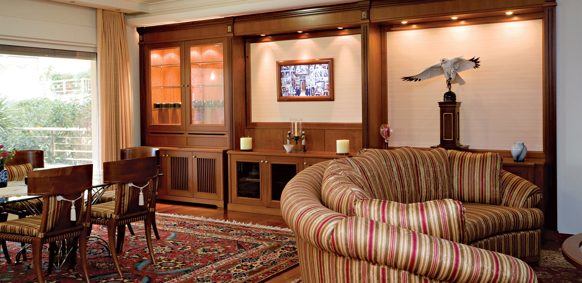 Το σχεδιαστικό τμήμα της εταιρείας μας έλαβε υπόψη της κάθε λεπτομέρεια για να αξιοποιήσει τις διαστάσεις του χώρου, σεβόμενοι την ευρυχωρία του. Για παράδειγμα, πίσω από τις ξύλινες πόρτες υπάρχουν ράφια γεμάτα με εκατοντάδες δίσκους 4Κ UHD και BluRay που συλλέγει ακατάπαυστα, ενώ εσωτερικά στον ξυλόφουρνο βρίσκεται αθέατα εγκαταστημένο το μεγάλο rack με τα ηλεκτρονικά συστήματα του. Στο κέντρο της πέργκολας οροφής τοποθετήθηκε ένας μηχανισμός δυο κινήσεων, που ρυθμίζει το ύψος και την απόσταση του βιντεοπροβολέα από την οθόνη, για να απολαμβάνει τις ταινίες του στην τεράστια οθόνη σε όποια διάσταση επιθυμεί!