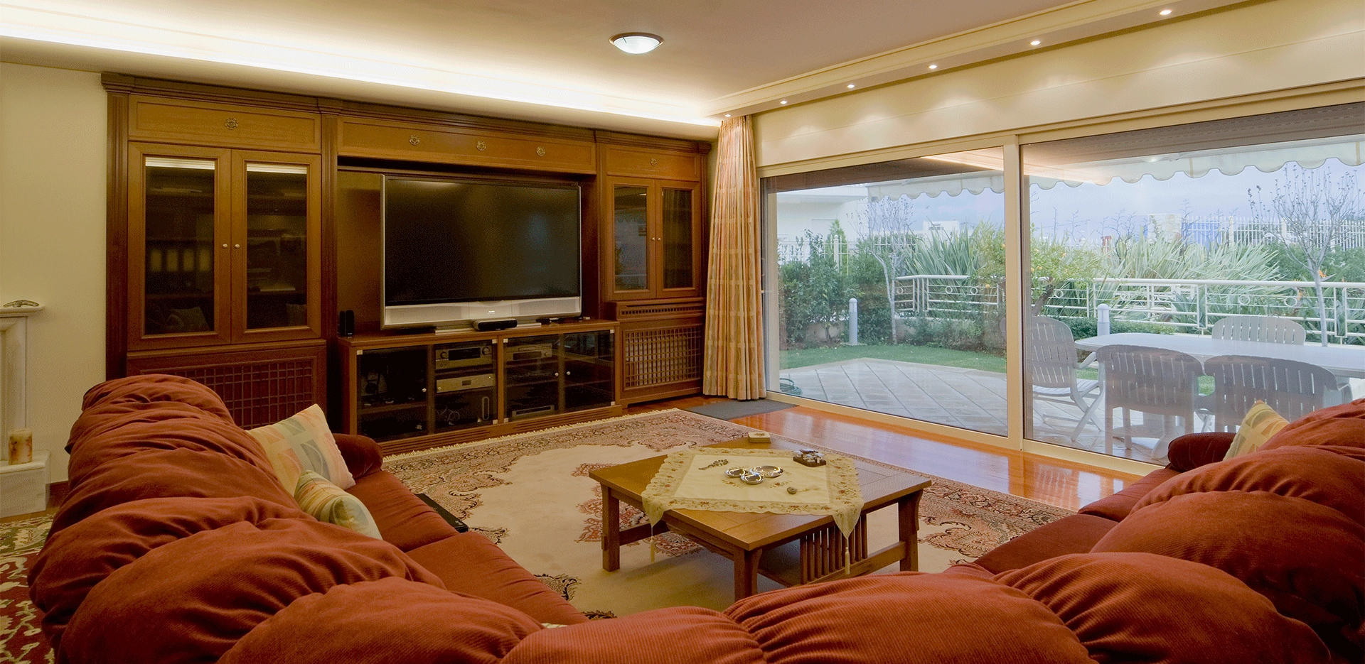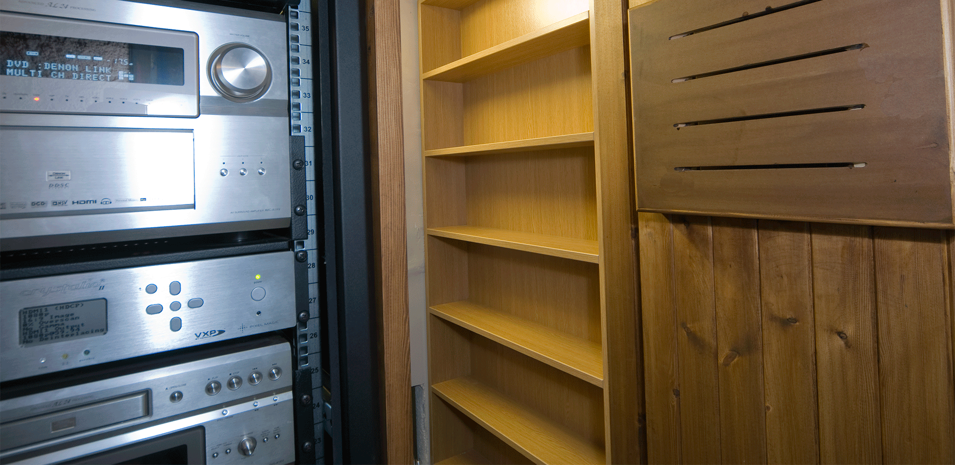 Το σχεδιαστικό τμήμα της εταιρείας μας έλαβε υπόψη της κάθε λεπτομέρεια για να αξιοποιήσει τις διαστάσεις του χώρου, σεβόμενοι την ευρυχωρία του. Για παράδειγμα, πίσω από τις ξύλινες πόρτες υπάρχουν ράφια γεμάτα με εκατοντάδες δίσκους 4Κ UHD και BluRay που συλλέγει ακατάπαυστα, ενώ εσωτερικά στον ξυλόφουρνο βρίσκεται αθέατα εγκαταστημένο το μεγάλο rack με τα ηλεκτρονικά συστήματα του. Στο κέντρο της πέργκολας οροφής τοποθετήθηκε ένας μηχανισμός δυο κινήσεων, που ρυθμίζει το ύψος και την απόσταση του βιντεοπροβολέα από την οθόνη, για να απολαμβάνει τις ταινίες του στην τεράστια οθόνη σε όποια διάσταση επιθυμεί!